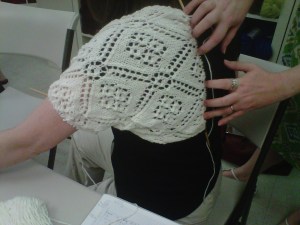Here are some crappy cell phone photos from the design-your-own lace shrug class.  In this class, students had to choose a lace pattern, chart it for themselves, then knit a basic shrug beginning with a  provisional cast-on at center back.  They had a lot of fun!